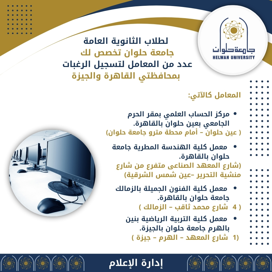 جامعة حلوان تخصص عدد من المعامل لتسجيل رغبات طلاب الثانوية