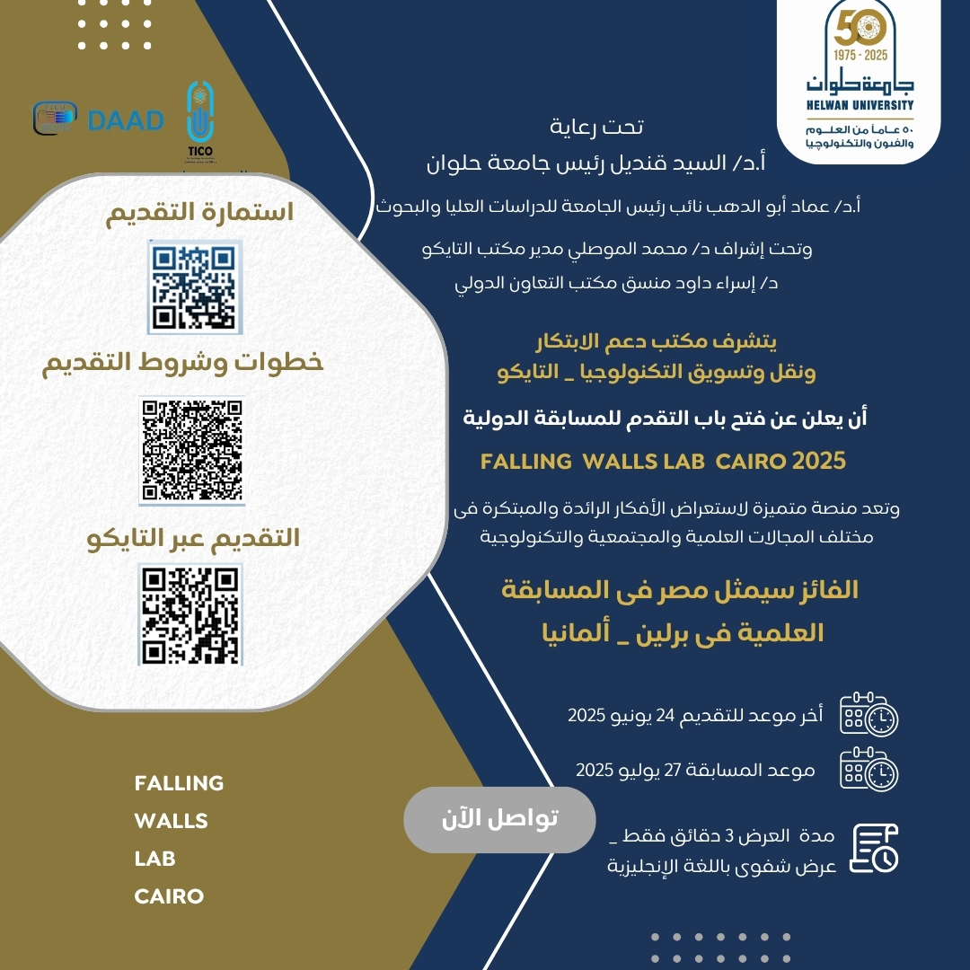 جامعة حلوان تعلن فتح باب التقدم للمشاركة فى مسابقة DAAD برعاية “falling walls lab cairo 2025”