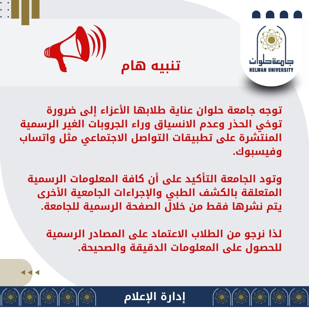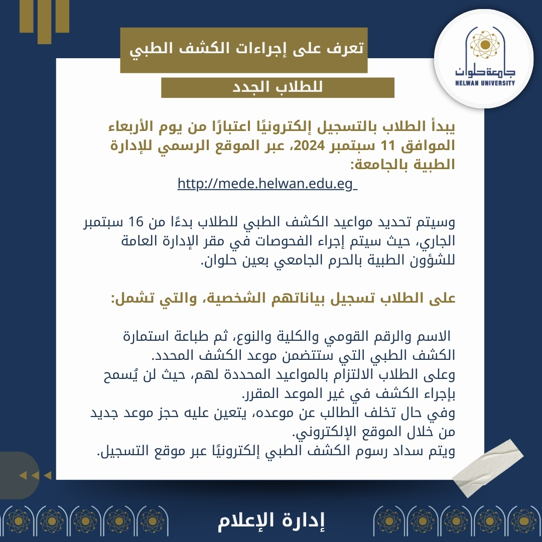 جامعة حلوان تعلن إجراءات الكشف الطبي للطلاب الجدد للعام الدراسي